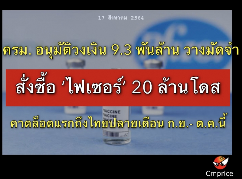 (17 ส.ค. 64) คณะรัฐมนตรี(ครม.) มีมติเห็นชอบกรอบวงเงินจำนวน 9,372 ล้านบาท สำหรับการจัดซื้อวัคซีนยี่ห้อไฟเซอร์ จำนวน 20,001,150 โดส ล็อตแรกถึงไทย ก.ย.-ธ.ค. ปีนี้