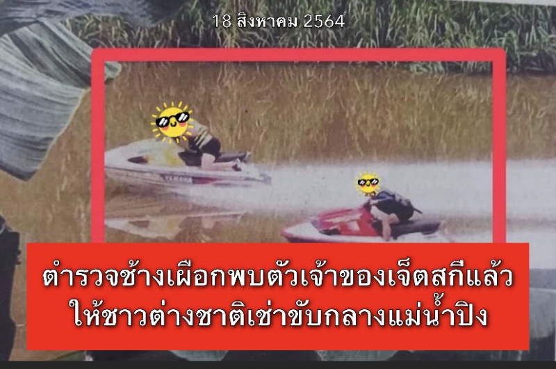 ตำรวจช้างเผือกพบตัวเจ้าของเจ็ตสกีแล้วให้ชาวต่างชาติเช่าขับกลางแม่น้ำปิงก่อความเดือดร้อน ส่งดำเนินคดีตามกฎหมาย