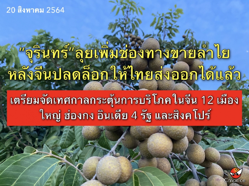 “จุรินทร์”ลุยเพิ่มช่องทางขายลำไย หลังจีนปลดล็อกให้ไทยส่งออกได้แล้ว เตรียมจัดเทศกาลกระตุ้นการบริโภคในจีน 12 เมืองใหญ่ ฮ่องกง อินเดีย 4 รัฐ และสิงคโปร์ พร้อมเปิดเวทีจับคู่เจรจาธุรกิจ เพิ่มโอกาสส่งออก และอัดฉีดเงินสนับสนุนผู้รวบรวมลำไย รับเรื่องชงเยียวเข้าบอร์ดผลไม้ ส่วนทุเรียนภาคใต้ ปัญหายุติเช่นกัน ล้งเข้ารับซื้อเต็มที่แล้ว