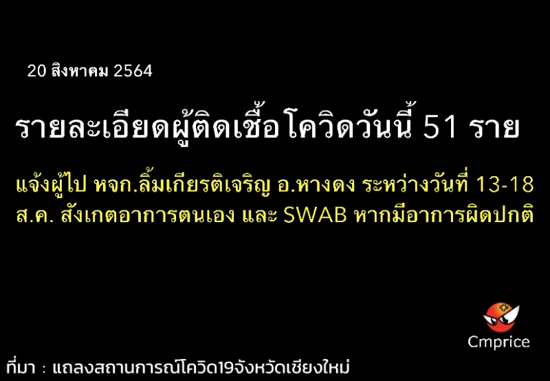 จังหวัดเชียงใหม่ แจ้งผู้ที่มีประวัติเดินทางไปห้างหุ้นส่วนจำกัดลิ้มเกียรติเจริญ ตำบลหางดง อำเภอหางดง ระหว่างวันที่ 13-18 สิงหาคม 2564 สังเกตอาการตนเอง และเข้า SWAB หากพบอาการผิดปกติ พร้อมกักตัว 14 วัน ด้านคลัสเตอร์กลุ่มรถวิบาก อำเภอเชียงดาว พบผู้ติดเชื้อเพิ่มอีก 2 ราย เกิดจากผู้เสี่ยงสูงละเลยการกักตัว