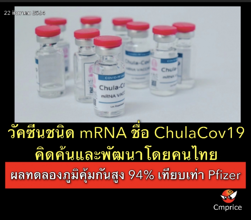 | • วัคซีนชนิด mRNA ชื่อ ChulaCov19 คิดค้นและพัฒนาโดยคนไทย ผลทดลองภูมิคุ้มกันสูง 94% เทียบเท่า Pfizer |