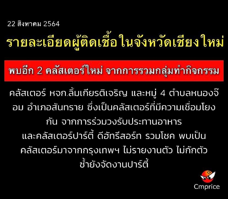 สำหรับ 2 คลัสเตอร์ใหม่วันนี้ ได้แก่ คลัสเตอร์แรก หจก.ลิ้มเกียรติเจริญ และหมู่ 4 ตำบลหนองจ๊อม อำเภอสันทราย เป็นคลัสเตอร์ที่มีความเชื่อมโยงกัน พบผู้ติดเชื้อเพิ่ม 1 ราย รวมผู้ติดเชื้อสะสมคลัสเตอร์นี้ 15 ราย โดยผู้ติดเชื้อ จาก หจก.ลิ้มเกียรติเจริญ เป็น 1 ในสมาชิกวงรับประทานอาหารที่ ม.4 หนองจ๊อม ซึ่งผู้ติดเชื้อคนแรกของทั้ง 2 วง เริ่มมีอาการป่วยในวันที่ 15 สิงหาคม 2564 จึงยังไม่สามารถระบุได้ว่าการติดเชื้อเริ่มจากวงใด แต่จากการสอบสวนพบว่าผู้ที่มาร่วมรับประทานอาหารที่หมู่ 4 ตำบลหนองจ๊อม อำเภอสันทราย เป็นคนทำงานอยู่ในหลายบริษัท ประกอบด้วย บริษัท เอส.เค.เมเนจเม้นท์ แอนด์ ซัพพลาย จำกัด ลำพูน, บริษัท เคเอ็มคอนเซ็นติ้ง คอร์ปอเรชั่น ลำพูน, บริษัท ฮิตาชิ ลำพูน, หจก.ลิ้มเกียรติเจริญ เชียงใหม่, บริษัท แซนส์ โซลูชั่น จำกัด เชียงใหม่ ทั้งนี้ขอให้ผู้ที่ไปใช้บริการ บริษัท แซนส์ โซลูชั่น จำกัด ที่ตั้งอยู่หมู่ 5 ฟ้าฮ่าม เชียงใหม่ ระหว่างวันที่ 16-22 สิงหาคม 2564 สังเกตอาการตนเอง หากพบอาการผิดปกติให้เข้ารับการตรวจหาเชื้อทันที