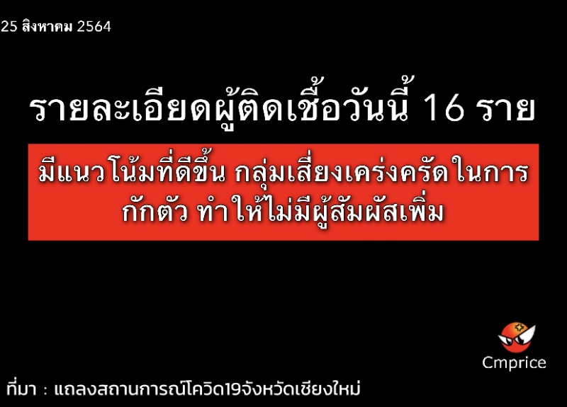 วันนี้ (25 ส.ค. 64) ที่ศูนย์บัญชาการสถานการณ์การระบาดโรค Covid-19 จังหวัดเชียงใหม่ ดร.ทรงยศ คำชัย หัวหน้ากลุ่มงานควบคุมโรคติดต่อ สำนักงานสาธารณสุขจังหวัดเชียงใหม่ แถลงสถานการณ์การระบาดโรค Covid-19 จังหวัดเชียงใหม่ประจำวัน ว่า เมื่อวานนี้ (24 ส.ค. 64) ได้มีการตรวจคัดกรองหาเชื้อโควิด-19 ในกลุ่มผู้สัมผัสหรือผู้เสี่ยงสูง จำนวน 2,425 ราย พบผู้มีผลบวก 16 ราย คิดเป็นร้อยละ 0.66 ที่เหลือเป็นผู้ที่มีผลบวกมาแล้วจากต่างจังหวัดและขอกลับมารักษาตัวที่ภูมิลำเนา โดยปัจจัยเสี่ยงของการติดเชื้อพบว่าการสัมผัสในครอบครัวสูงขึ้นมาก และการจากแหล่งระบาดในต่างจังหวัดก็ยังคงสูง ขณะที่การสัมผัสในสถานที่ทำงาน และชุมชน มีสัดส่วนที่ลดลง