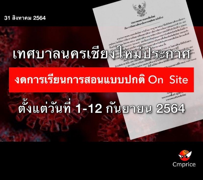 สำนักการศึกษา เทศบาลนครเชียงใหม่ ได้โพสต์แจ้งประกาศจาก เทศบาลนครเชียงใหม่ เรื่อง การปิดสถานศึกษาเนื่องจากเหตุพิเศษ ( ฉบับที่ 4 ) งดใช้อาคารในการจัดการเรียนการสอนแบบปกติ On  Site ตั้งแต่วันที่ 1-12 กันยายน 2564