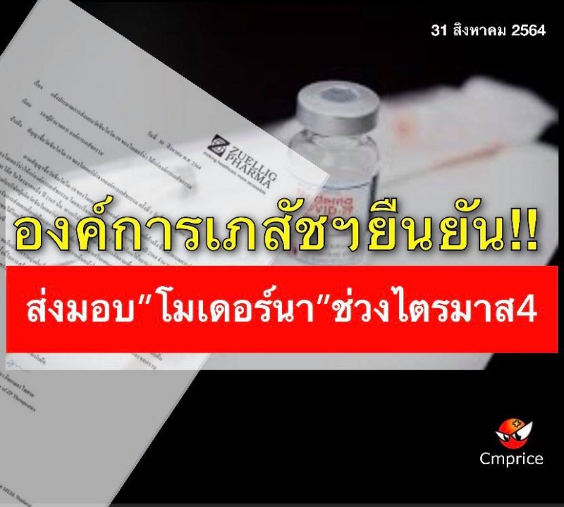 จากการติดตามความคืบหน้าอย่างต่อเนื่องขององค์การเภสัชกรรม ร่วมกับ บริษัท ซิลลิค ฟาร์มา จํากัด ซึ่งเป็นตัวแทนจำหน่ายวัคซีนโมเดอร์นา ล่าสุด บริษัทซิลลิคฯ ได้มีหนังสือมายังองค์การเภสัชกรรม เมื่อวันที่ 30 สิงหาคม 2564 ว่า วัคซีนโมเดอร์นา จะเริ่มทยอยส่งมอบในไตรมาสที่ 4 ของปี 2564 (ตุลาคม-ธันวาคม) จำนวน 1,958,400 โดส และในไตรมาสที่ 1 ปี 2565 (มกราคม-มีนาคม) อีกจำนวน 3,110,400 โดส โดยที่ผ่านมาบริษัท ซิลลิคฯ ได้มีการติดต่อประสานงานกับบริษัทผู้ผลิตวัคซีนโมเดอร์นามาโดยตลอด และพยายามอย่างยิ่งยวดในการติดตามเพื่อจะให้ได้วัคซีนโมเดอร์นาล็อตแรกสำหรับการส่งมอบตั้งแต่เดือนตุลาคมนี้เป็นต้นไป เพื่อมาเสริมแผนการฉีดวัคซีนของภาครัฐและสนับสนุนการฉีดวัคซีนให้แก่ประชาชนให้ได้โดยเร็วที่สุด อย่างไรก็ตามบริษัทแจ้งว่า หากมีความคืบหน้าในการส่งมอบวัคซีนล็อตแรกเพิ่มเติม ทางบริษัทจะได้รีบแจ้งให้ทราบโดยทันที