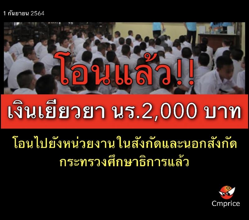 - สพฐ. รับเงินเยียวยา ทั้งการรับเงินโอนเข้าบัญชี หรือรับเงินสดที่โรงเรียน ตั้งแต่วันที่ 1-7 กันยายน 2564