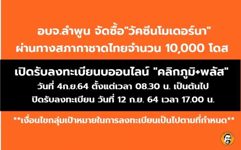 อบจ.ลำพูน จัดซื้อวัคซีน Moderna ผ่านทางสภากาชาดไทยจำนวน 10,000 โดส เปิดรับลงทะเบียน วันที่ 4 กันยายน 2564 เป็นต้นไป