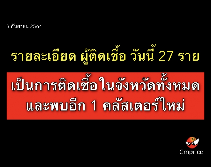 สำหรับผู้ติดเชื้อ 27 รายใหม่ ในวันนี้ เป็นผู้ติดเชื้อในจังหวัดทั้งหมด โดยเป็นผู้สัมผัสผู้ติดเชื้อรายก่อนหน้า 2 ราย อยู่ระหว่างการสอบสวนโรค 1 ราย และมาจากคลัสเตอร์/กลุ่มต่าง ๆ ประกอบด้วย คลัสเตอร์ร้านหมูใจดี และ บริษัทจิตรุ่งเรืองกรุ๊ป หมู่ที่ 10 อำเภอสันกำแพง จำนวน 5 ราย รวมผู้ติดเชื้อสะสม 38 ราย โดย CM7069 อาศัยอยู่ที่ตำบลแม่คืออำเภอดอยสะเก็ด เป็นสามีของ CM7044 ทำงานขับรถส่งหมูจากบริษัทจิตรุ่งเรืองกรุ๊ป ส่วนอีก 4 ราย คือ CM7078 ถึงCM7081 เป็นผู้สัมผัสในครอบครัวของ CM6802 ที่ทำงานร้านหมูใจดี พบระหว่างการกักตัว ทำให้ไม่มีผู้ติดเชื้อเพิ่มจึงขอแจ้งให้ผู้ที่ติดต่อธุรกิจ/รับส่งสินค้า หรือมีประวัติเดินทางไปที่ บริษัทจิตรุ่งเรืองกรุ๊ป ระหว่างวันที่ 19-30 สิงหาคม2564 ให้เข้ารับการตรวจหาเชื้อโควิด-19 ที่โรงพยาบาลทุกแห่ง พร้อมกักตัว 14 วัน นับจากวันที่สัมผัสเสี่ยงวันสุดท้าย
