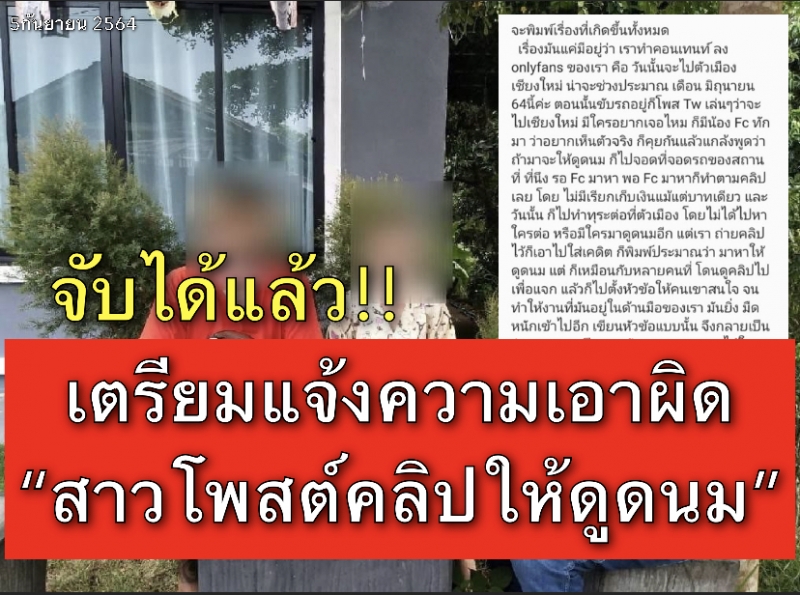| • จับได้แล้ว เตรียมแจ้งความเอาผิดสาวโพสต์คลิปให้ดูดนม |