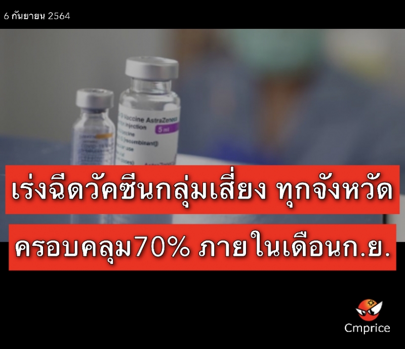 | • เร่งฉีดวัคซีนกลุ่มเสี่ยง ทุกจังหวัด ครอบคลุม70% เดือนก.ย. |