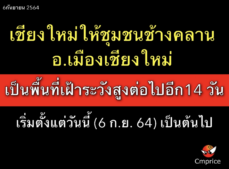 คณะกรรมการโรคติดต่อจังหวัดเชียงใหม่ มีมติให้ชุมชนช้างคลาน อำเภอเมืองเชียงใหม่ เป็นพื้นที่เฝ้าระวังสูงต่อไปอีก 14 วันเริ่มตั้งแต่วันนี้ (6 ก.ย. 64) เป็นต้นไป