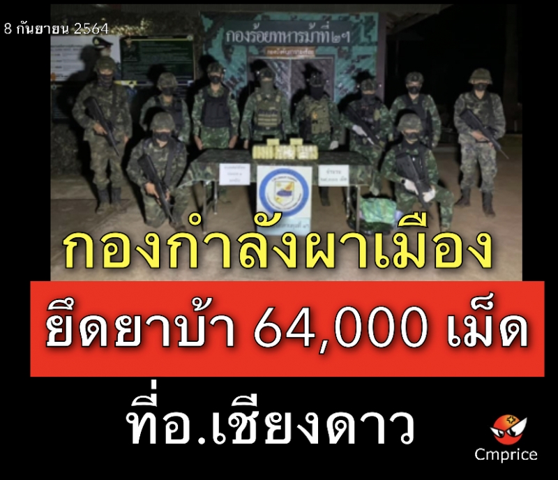 ค่ำวานนี้ (7 ก.ย. 64) ที่บริเวณบ้านอรุโณทัย หมู่ที่ 10 ตำบลมืองนะ อำเภอเชียงดาว จังหวัดเชียงใหม่ กองร้อยทหารม้าที่ 2 หน่วยเฉพาะกิจกรมทหารม้าที่ 5 ลาดตระเวนตรวจพบบุคคลต้องสงสัย จำนวน 2 คน แต่งกายคล้ายชาวบ้าน เดินแบกสัมภาระลัดเลาะตามภูมิประเทศ ท่าทางมีพิรุธ จึงได้แสดงตัวเพื่อขอทำการตรวจค้น แต่เมื่อกลุ่มคนดังกล่าวพบเห็นเจ้าหน้าที่ จึงได้อาศัยความชำนาญในพื้นที่วิ่งหลบหนีไปอย่างรวดเร็ว หน่วยเฉพาะกิจกรมทหารม้าที่ 5 จึงได้เข้าตรวจสอบพื้นที่โดยรอบ พบกระสอบเป้ 1 ใบ บรรจุยาเสพติดให้โทษประเภท 1 (ยาบ้า) ประมาณ 64,000 เม็ด
