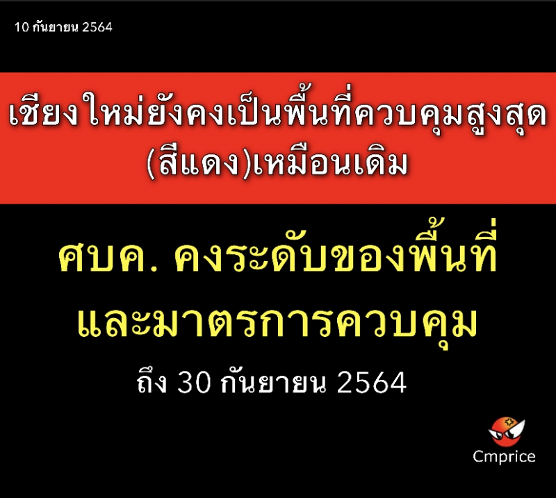 | • ศบค. คงระดับของพื้นที่และมาตรการควบคุมถึง 30 กย. เชียงใหม่ยังคงเป็นพื้นที่ควบคุมสูงสุด (สีแดง)เหมือนเดิม |