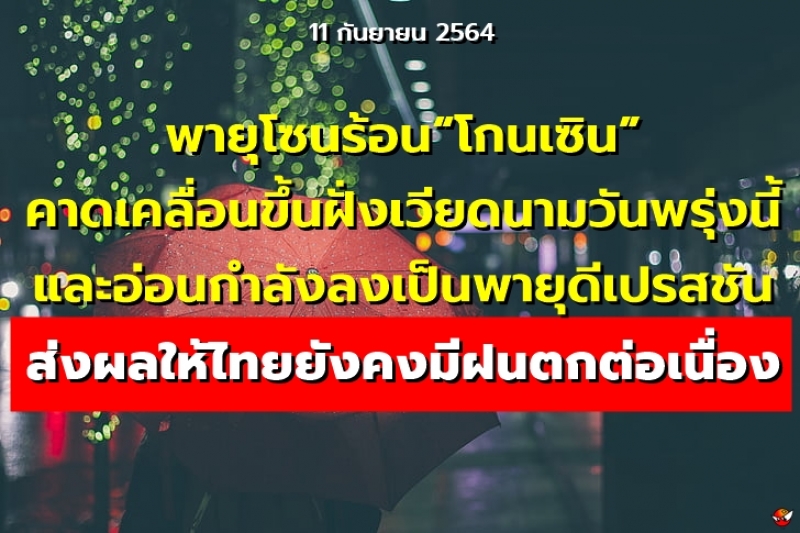 เมื่อเวลา 10.00 น. ของวันนี้ (11 ก.ย. 64) พายุโซนร้อนกำลังแรง “โกนเซิน” บริเวณทะเลจีนใต้ตอนกลาง มีศูนย์กลางอยู่ห่างประมาณ 185 กิโลเมตร ทางตะวันออกเฉียงใต้ของเมืองดานัง ประเทศเวียดนาม หรืออยู่ที่ละติจูด 15.7 องศาเหนือ ลองจิจูด 109.9 องศาตะวันออก มีความเร็วลมสูงสุดใกล้ศูนย์กลางประมาณ 100 กิโลเมตรต่อชั่วโมง และกำลังเคลื่อนตัวทางทิศตะวันตกด้วยความเร็วประมาณ 13 กม./ชม. คาดว่าเคลื่อนขึ้นฝั่งบริเวณเมืองดานัง ประเทศเวียดนามในวันพรุ่งนี้ (12 ก.ย. 64) หลังจากนั้นจะอ่อนกำลังลงเป็นพายุดีเปรสชัน และหย่อมความกดอากาศต่ำกำลังแรงตามลำดับในขณะที่มีร่องมรสุมพาดผ่านภาคเหนือตอนล่าง ภาคกลางตอนบน และภาคตะวันออกเฉียงเหนือ ลักษณะเช่นนี้จึงส่งผลทำให้ประเทศไทยยังคงมีฝนตกต่อเนื่องและมีฝนตกหนักถึงหนักมากบางแห่ง ขอให้ประชาชนที่อาศัยอยู่ในพื้นที่เสี่ยงภัยบริเวณดังกล่าว ระวังอันตรายจากฝนตกหนักและฝนตกสะสมซึ่งอาจทำให้เกิดน้ำท่วมฉับพลันและน้ำป่าไหลหลากได้