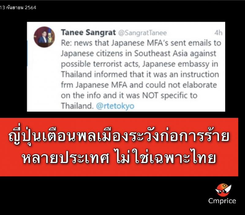 โฆษก กต. ชี้แจงกรณีญี่ปุ่นแจ้งเตือนพลเมืองในไทยระมัดระวังการก่อการร้าย ระบุได้สอบถามกระทรวงการต่างประเทศญี่ปุ่น พบว่าเป็นการเตือนชาวญี่ปุ่นในเอเชียตะวันออกเฉียงใต้ ไม่ใช่เฉพาะไทย