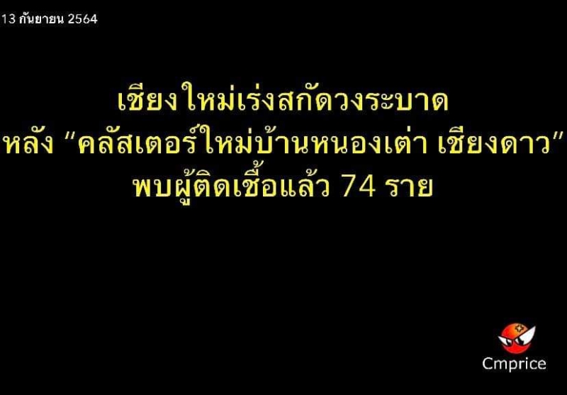 คลัสเตอร์พนักงานห้างสรรพสินค้าเซ็นทรัลเฟสติวัล เซ็นทรัลเชียงใหม่แอร์พอร์ต และครอบครัว พบผู้ติดเชื้อเพิ่ม 13 ราย รวมผู้ติดเชื้อสะสม 27 ราย โดยผู้ติดเชื้อทั้งหมด แยกเป็นแม่บ้านทำความสะอาดบริเวณชั้นสอง ห้างสรรพสินค้าเซ็นทรัลเฟสติวัล 5 ราย ขายของที่โรงอาหารสำหรับพนักงาน 13 ราย พนักงานแผนกอื่นๆ 2 ราย พนักงานเซ็นทรัล แอร์พอร์ต มาช่วยงาน 1 ราย ที่เหลือเป็นผู้สัมผัสร่วมบ้าน นอกจากนี้ ยังพบพนักงานขับรถฟู๊ดแพนด้า ที่รับ-ส่ง อาหารที่ห้างทุกวัน ติดเชื้อด้วย จึงขอประกาศให้พนักงานห้างสรรพสินค้าเซ็นทรัลเฟสติวัลทุกแผนก โดยเฉพาะผู้ที่เข้าไปใช้โรงอาหารของพนักงาน เข้ารับการตรวจหาเชื้อโควิด-19 ในวันพรุ่งนี้ (14 ก.ย. 64) ที่ศูนย์ประชุมและแสดงสินค้านานาชาติ บริเวณด้านข้างอาคาร SME โดยให้เข้าทางประตู 5 เท่านั้น รวมทั้งพนักงานขับรถส่งอาหารของทุกบริษัท ที่ประจำจุดรับ-ส่ง อาหารเซ็นทรัลเฟสติวัล ระหว่างวันที่ 7-11 กันยายน 2564 ให้เข้ารับการตรวจด้วยเช่นกัน