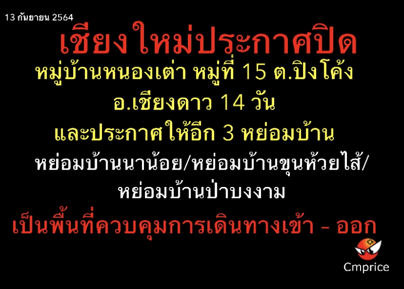 | • ปิดหมู่บ้านหนองเต่า เชียงดาว 14 วัน พร้อมประกาศให้อีก 3 หย่อมบ้าน เป็นพื้นที่ควบคุมการเดินทางเข้า ออก |
