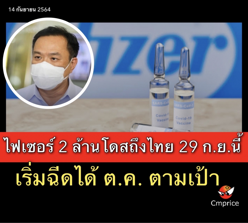 | • ไฟเซอร์ 2 ล้านโดสถึงไทย 29 ก.ย.นี้ เริ่มฉีดได้ ต.ค. ตามเป้า |