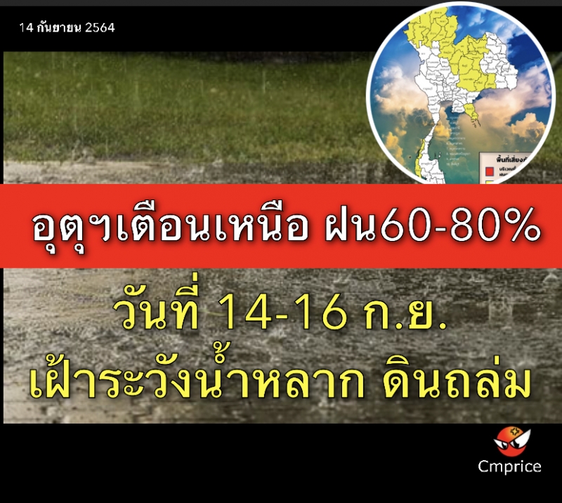 | • อุตุฯเตือนเหนือฝน60-80% ระหว่างวันที่ 14-16 ก.ย. เฝ้าระวังน้ำหลาก ดินถล่ม |