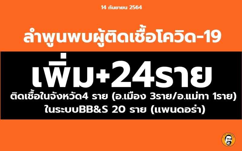 14กันยายน64 ศูนย์ข่าวโควิด 19 ลำพูน ได้แถลง ลำพูนพบผู้ติดเชื้อเพิ่ม 24ราย โดยเป็นการติดเชื้อในจังหวัด 4ราย ในBubble&Seal(แพนดอร่า)20ราย (ดูและฟังแถลง ได้ข้างล่างสุด )