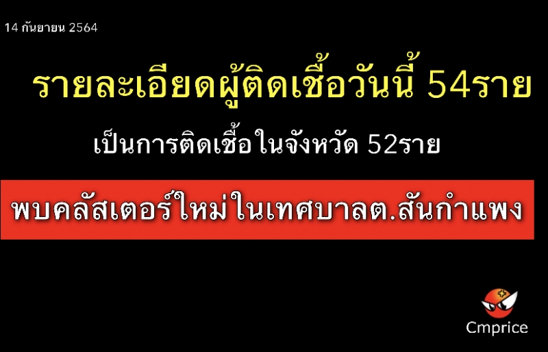 วันนี้ (14 ก.ย. 64) ที่ศูนย์บัญชาการสถานการณ์การระบาดโรค Covid-19 จังหวัดเชียงใหม่ ดร.ทรงยศ คำชัย หัวหน้ากลุ่มงานควบคุมโรคติดต่อ สำนักงานสาธารณสุขจังหวัดเชียงใหม่ แถลงสถานการณ์การระบาดโรค Covid-19 จังหวัดเชียงใหม่ประจำวัน ว่า มีผู้ติดเชื้อรายใหม่ 54 ราย เป็นผู้ติดเชื้อจากต่างจังหวัดเพียง 2 ราย จากกรุงเทพมหานคร ส่วนอีก 52 ราย เป็นผู้ติดเชื้อภายในจังหวัด โดยอยู่ระหว่างสอบสวนโรค 2 ราย และมาจากคลัสเตอร์ต่าง ๆ ประกอบด้วย คลัสเตอร์บริษัท Chiangmai Frozen Food 17 ราย โดย 15 ราย เป็นกลุ่มเสี่ยงสูงเดิมที่อยู่ในแผนกคัดและบรรจุผลิตภัณฑ์ พบระหว่างการกักตัว ส่วนใหญ่อยู่ในพื้นที่อำเภอแม่แตง ส่วนอีก 2 ราย เป็นผู้สัมผัสในครอบครัวเสี่ยงสูง พบระหว่างการกักตัวเช่นเดียวกัน รวมผู้ติดเชื้อสะสม 70 ราย, คลัสเตอร์เพื่อนร่วมวงสังสรรค์ ตำบลสันปูเลย อำเภอดอยสะเก็ด และร้านเมายำคาเฟ่ 11 ราย รวมผู้ติดเชื้อสะสม 43 ราย โดยส่วนใหญ่เป็นกลุ่มผู้ที่ไปใช้บริการร้านเมายำคาเฟ่ และยังพบการแพร่ระบาดไปยังร้าน DK เมทัลชีส ขณะนี้ได้ให้พนักงานทุกคนเข้ารับการตรวจหาเชื้อแล้ว