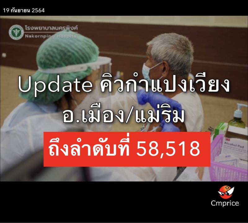 ในวันนี้ มีการเรียกคิวผู้ที่ลงทะเบียนฉีดวัคซีนทางระบบกำแปงเวียง อำเภอเมือง/แม่ริม เพิ่มเติม จนถึงลำดับที่ 58,518 สำหรับการฉีดวัคซีนระหว่างวันที่ 20-22 กันยายน