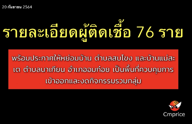 วันนี้ (20 ก.ย. 64) ที่ศูนย์บัญชาการสถานการณ์การระบาดโรค Covid-19 จังหวัดเชียงใหม่ นายกนก ศรีวิชัยนันท์ ปลัดจังหวัดเชียงใหม่ เปิดเผยว่าตามที่สำนักงานสาธารณสุขจังหวัดเชียงใหม่ พบการติดเชื้อโรคโควิด – 19 เป็นกลุ่มก้อน ในพื้นที่อำเภออมก๋อย คณะกรรมการโรคติดต่อจังหวัดเชียงใหม่ จึงได้มีมติออกคำสั่งที่ ปิดสถานที่เสี่ยงเป็นการชั่วคราว รวม 2 หมู่บ้าน ที่บ้านอูแจะ ตำบลสบโขง และที่บ้านแม่สะเต ตำบลนาเกียน โดยคำสั่งที่ 157/2564 ให้ปิดบ้านอูแจะ หมู่ที่ 6 ตำบลสบโขง อำเภออมก๋อย จังหวัดเชียงใหม่ เป็นเวลา 14 วัน ตั้งแต่วันที่ 19 กันยายน 2564 ถึงวันที่ 2 ตุลาคม 2564 และคำสั่งที่ 158/2564 ให้ปิดหมู่บ้านแม่สะเต หมู่ที่ 11 ตำบลนาเกียน อำเภออมก๋อย จังหวัดเชียงใหม่ เป็นเวลา 14 วัน ตั้งแต่วันที่ 20 กันยายน ถึงวันที่ 3 ตุลาคม 2564 ทั้งนี้เพื่อให้การควบคุมและป้องกันโรคในพื้นที่ดังกล่าว เป็นไปด้วยความเรียบร้อยและเกิดประสิทธิภาพสูงสุด พร้อมขอความร่วมมืองดการเดินทางเข้าไปในพื้นที่ดังกล่าว โดยไม่มีเหตุจำเป็น เพื่อลดความเสี่ยงต่อการสัมผัสโรค