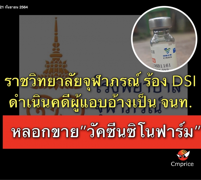 ราชวิทยาลัยจุฬาภรณ์ ร้อง DSI ดำเนินคดีผู้แอบอ้างเป็น จนท. หลอกขาย”วัคซีนซิโนฟาร์ม”