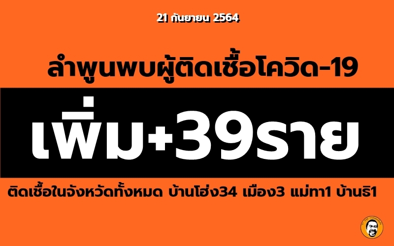 21กันยายน64 ศูนย์ข่าวโควิด 19 ลำพูน ได้แถลง ลำพูนพบผู้ติดเชื้อเพิ่ม 39ราย โดยเป็นการติดเชื้อในจังหวัด 39ราย (ดูและฟังแถลง ได้ข้างล่างสุด ) แบ่งตามพื้นที่พบใน อ.เมือง24 อ.บ้านโฮ่ง9 อ.ป่าซาง3