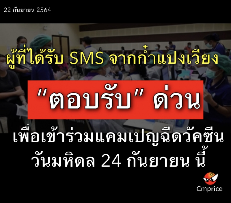 ผู้ที่ได้รับ SMS จากก๋ำแปงเวียง “ตอบรับ” ด่วน เพื่อเข้าร่วมแคมเปญฉีดวัคซีน วันมหิดล 24 กันยายน นี้