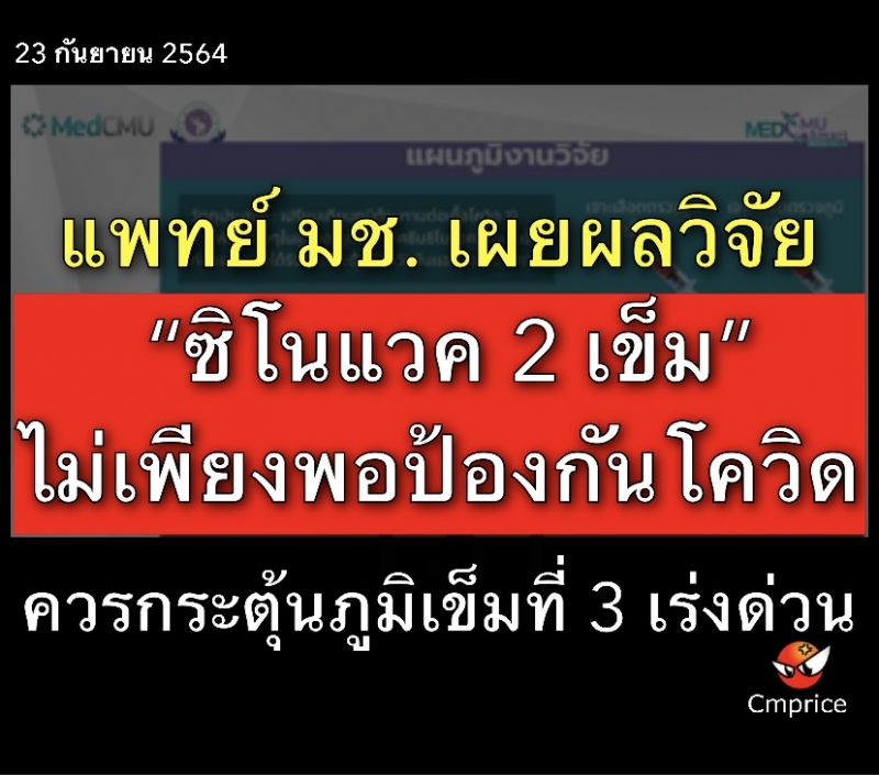 แพทย์ มช. เผยผลวิจัย “ซิโนแวค 2 เข็ม”ไม่เพียงพอป้องกันโควิด ควรกระตุ้นภูมิเข็มที่ 3 โดยเร่งด่วน