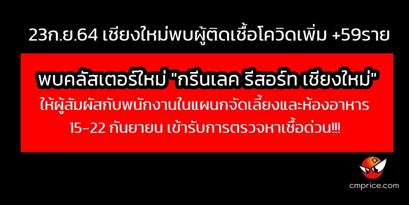ประกาศให้ผู้ที่เข้าใช้บริการ และสัมผัสกับพนักงานในแผนกจัดเลี้ยงและห้องอาหาร คลัสเตอร์ใหม่ “โรงแรมกรีนเลค รีสอร์ท เชียงใหม่” ระหว่างวันที่ 15-22 กันยายน เข้ารับการตรวจหาเชื้อด่วน พร้อมกักตัว 14 วัน นับจากวันที่สัมผัสผู้ติดเชื้อวันสุดท้าย