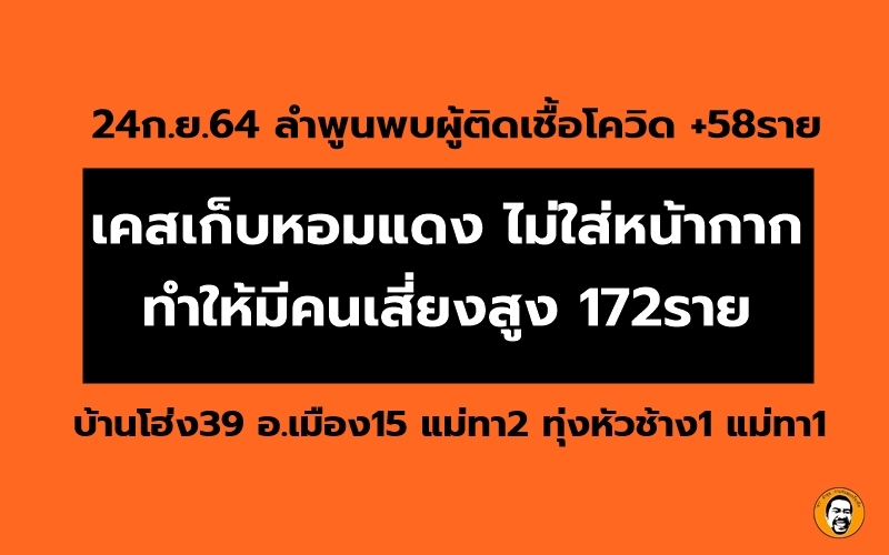 24กันยายน64 ศูนย์ข่าวโควิด 19 ลำพูน ได้แถลง ลำพูนพบผู้ติดเชื้อเพิ่ม 58ราย โดยเป็นการติดเชื้อในจังหวัด55ราย BB&S 3ราย แบ่งตามพื้นที่พบใน อ.บ้านโฮ่ง39 อ.เมือง15 อ.แม่ทา2 อ.บ้านธิ1 ทุ่งหัวช้าง1 (ดูและฟังแถลง ได้ข้างล่างสุด )