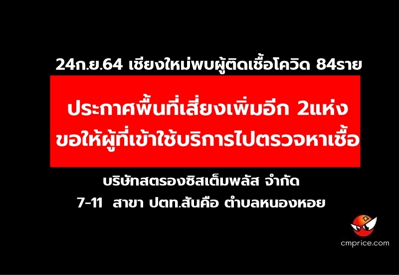 จึงขอประกาศให้ผู้ที่เข้าใช้บริการ หรือ สัมผัสกับพนักงานบริษัทสตรองซิสเต็มพลัส จำกัด (Strong System Plus Company Limited) ตำบลสุเทพ อำเภอเมืองเชียงใหม่ ระหว่างวันที่ 17-23 กันยายน 2564 และร้านเซเว่นอีเลฟเว่น สาขา ปตท.สันคือ ตำบลหนองหอย อำเภอเมืองเชียงใหม่ ระหว่างวันที่ 19-23 กันยายน 2564 ขอให้เข้ารับการตรวจหาเชื้อโควิด 19 ได้ที่จุดตรวจเฉพาะกิจศูนย์ประชุมและแสดงสินค้านานาชาติ หรือโรงพยาบาลทุกแห่ง พร้อมทั้งกักตัว 14 วัน นับจากวันที่สัมผัสผู้ติดเชื้อวันสุดท้าย