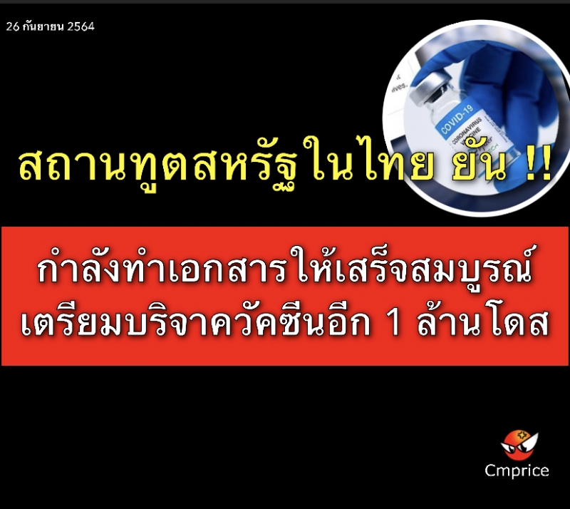 วันที่ 25 ก.ย.64สถานทูตสหรัฐอเมริกาประจำประเทศไทย ทวิตผ่านทวิตเตอร์ของสถานทูตสหรัฐอเมริกา มีข้อความว่า ดังที่เคยประกาศไว้ก่อนหน้านี้เมื่อเดือนกรกฎาคม สหรัฐฯ จะบริจาควัคซีนที่ปลอดภัยและมีประสิทธิภาพอีก 1 ล้านโดสให้กับไทย