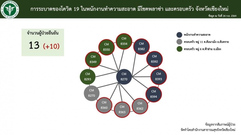พนักงานทำความสะอาด มีโชคพลาซ่า และครอบครัว 4 ราย และครอบครัวของพนักงานที่พบระหว่างการตรวจเชิงรุกติดเชื้ออีก 6 ราย , ปั้ม ปตท.สันคือ หนองหอย อำเภอเมืองเชียงใหม่ ซึ่งพบการระบาดในพนักงานเซเว่นอีเลฟเว่นก่อนหน้า วันนี้พบพนักงานปั๊มติดเชื้อเพิ่มอีก 1 ราย , วิทยาลัยเทคโนโลยีพาณิชยการลานนา พบผู้ติดเชื้อเพิ่ม 2 ราย โดยเป็นนักเรียนที่สัมผัสผู้ติดเชื้อรายก่อนหน้า 1 ราย และผู้ปกครองติดเชื้อเพิ่ม 1 ราย ซึ่งเป็นพนักงานขับรถสองแถวสีฟ้า เชียงใหม่-ลำพูน