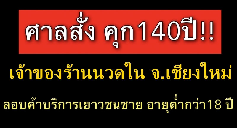 คุก140ปี เจ้าของร้านนวด ใน จ.เชียงใหม่ ลอบค้าบริการเยาวชนชาย อายุต่ำกว่า 18 ปี