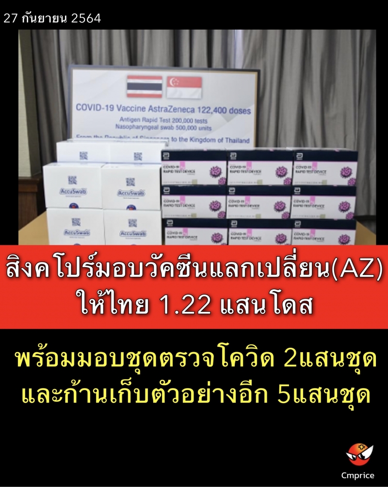 สิงคโปร์มอบวัคซีนแอสตร้าเซเนก้า จำนวน 122,400 โดส ให้ไทยวันนี้ (27 ก.ย.64) พร้อมมอบชุดตรวจ โควิด19 (Antigen Rapid Test) จำนวน 2 แสนชุด และก้านเก็บตัวอย่างเยื่อบุโพรงจมูก (nasopharyngeal swab) จำนวน 5 แสนชุด