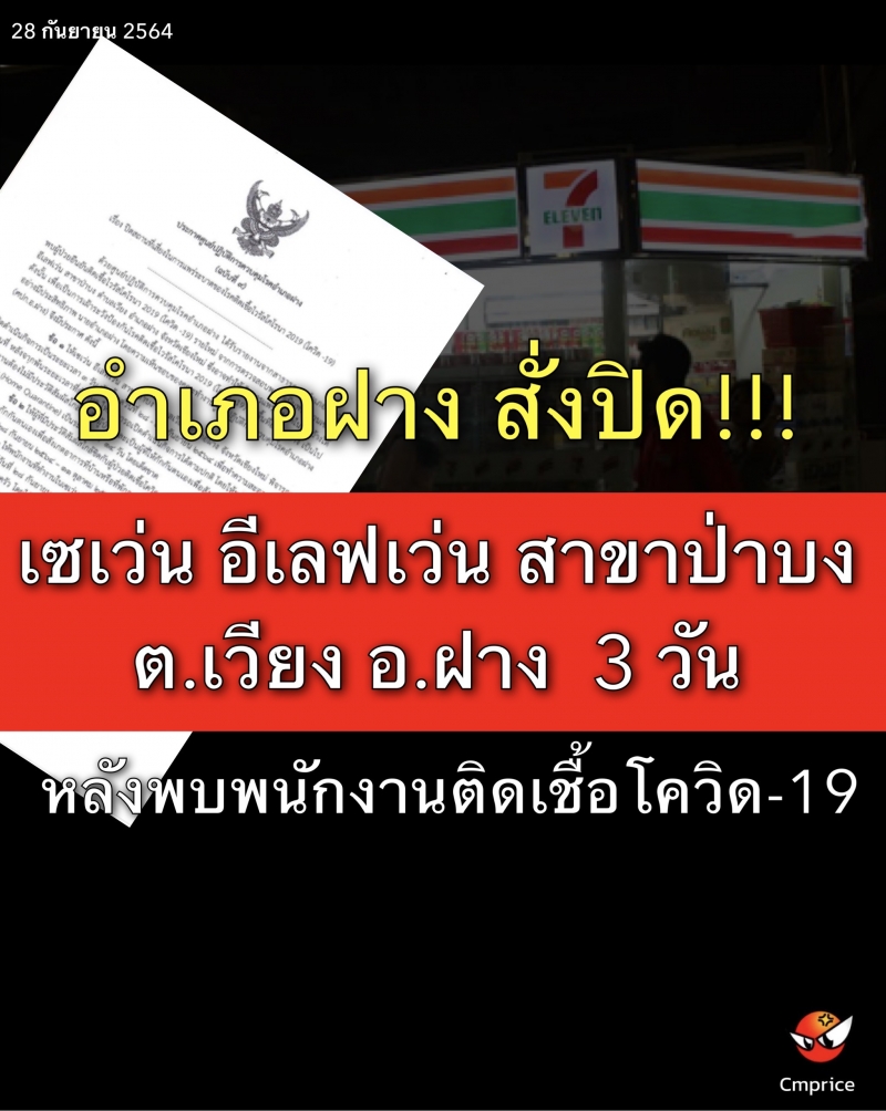 | • อ.ฝาง สั่งปิด เซเว่น อีเลฟเว่น สาขาป่าบง ต.เวียง อ.ฝาง 3 วัน หลังพบพนักงานติดเชื้อโควิด-19 ตั้งแต่วันที่28-30กันยายน 2564 |