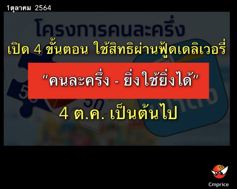 | • เปิด 4 ขั้นตอน ใช้สิทธิ คนละครึ่ง - ยิ่งใช้ยิ่งได้ ผ่านฟู้ดเดลิเวอรี่ 4 ต.ค. เป็นต้นไป |