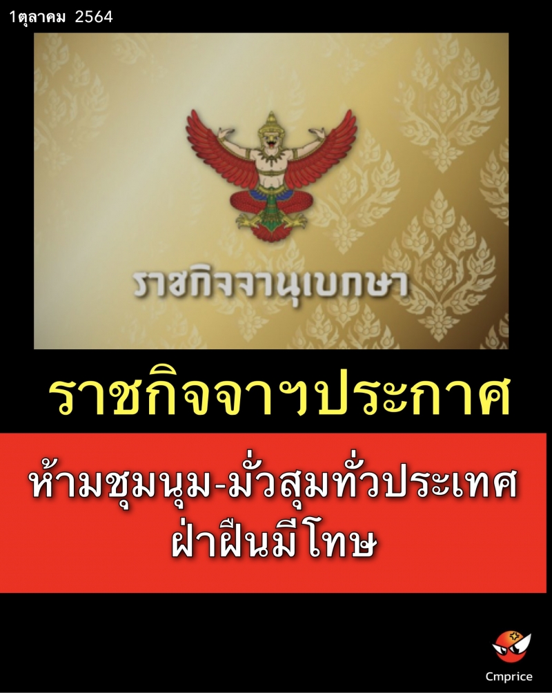 วันที่ 1 ต.ค. 2564 เว็บไซต์ "ราชกิจจานุเบกษา" เผยแพร่ ประกาศหัวหน้าผู้รับผิดชอบ ในการแก้ไขสถานการณ์ฉุกเฉินในส่วนที่เกี่ยวกับความมั่นคง เรื่อง ห้ามการชุมนุม การทำกิจกรรม การมั่วสุม ที่ก่อให้เกิดการแพร่ระบาดของโรคติดเชื้อไวรัสโคโรนา 2019 (โควิด-19) (ฉบับที่ ๑๑)