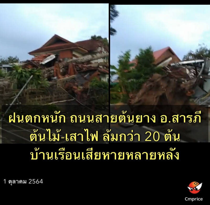 วันนี้ 1 ตุลาคม 2564 เวลาประมาณ 14.00 น. เกิดฝนตกหนัก ลมแรงทำให้ พื้นที่อ.สารภี จ.เชียงใหม่ ถนนสายเชียงใหม่- ลำพูน ต้นยางล้มหักโค่น บางต้นล้มทับเสาไฟฟ้า และยังมีเสาไฟฟ้าอีกหลายต้นที่หักล้มทับบ้านเรือนประชาชน จนท.ได้เข้าสำรวจความเสียหายสรุปความเสียหาย ดังนี้