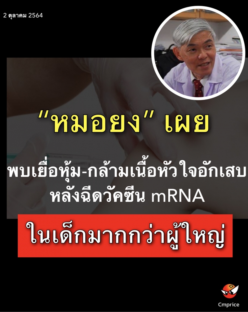 | • หมอยง เผยพบเยื่อหุ้ม-กล้ามเนื้อหัวใจอักเสบ หลังฉีดวัคซีน mRNA พบในเด็กมากกว่าผู้ใหญ่ |