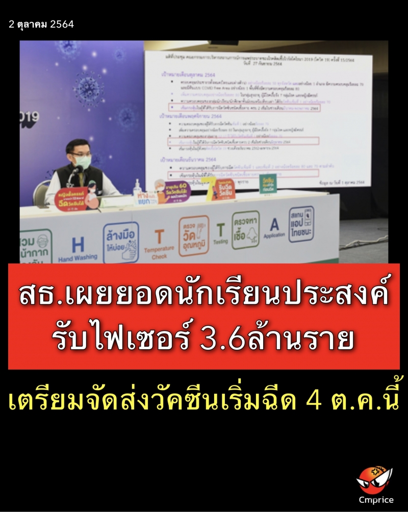 สธ.เผยยอดนักเรียนประสงค์รับไฟเซอร์ 3.6 ล้านราย เตรียมจัดส่งวัคซีนเริ่มฉีดวันที่ 4 ต.ค.นี้