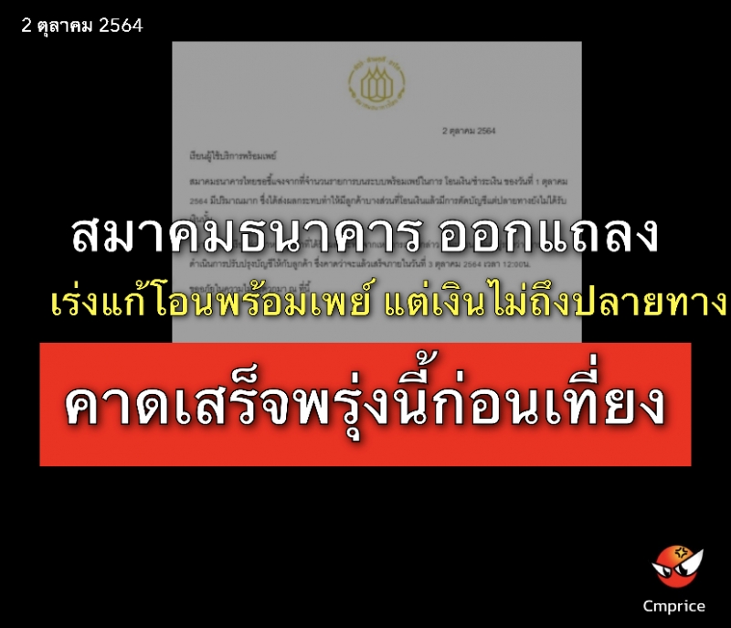 สมาคมธนาคารไทยขอชี้แจงจากที่จำนวนรายการบนระบบพร้อมเพย์ในการ โอนเงิน/ชำระเงิน ของวันที่ 1 ตุลาคม2564 มีปริมาณมาก ซึ่งได้ส่งผลกระทบทำให้มีลูกค้าบางส่วนที่โอนเงินแล้วมีการตัดบัญชีแต่ปลายทางยังไม่ได้รับเงินนั้น