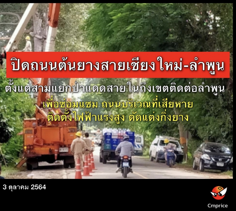 วันที่ 3 ต.ค.64 สภ.สารภีจังหวัดเชียงใหม่ แจ้งปิดถนนสายเชียงใหม่-ลำพูน ตั้งแต่ สามแยกป่าแดดสายใน ถึงเขตติดต่อลำพูน จะมีการ ปิดถนน เพื่อทำการซ่อมแซม ถนนบริเวณที่เสียหาย ติดตั้งไฟฟ้าแรงสูง ตัดแต่งกิ่งยาง เพื่อให้เจ้าหน้าที่ทำงานได้อย่างสะดวกรวดเร็ว ให้เส้นทางดังกล่าวกลับมาใช้ งานได้ตามปกติโดยเร็ว ขอให้รถทุกคัน กรุณาใช้เส้นทางอื่น ผู้ใดฝ่าฝืน จะไม่รับรองความปลอดภัย และอาจมีการเปรียบเทียบปรับในอัตราสูง ต้องเห็นใจผู้ปฎิบัติงานด้วยนะครับ