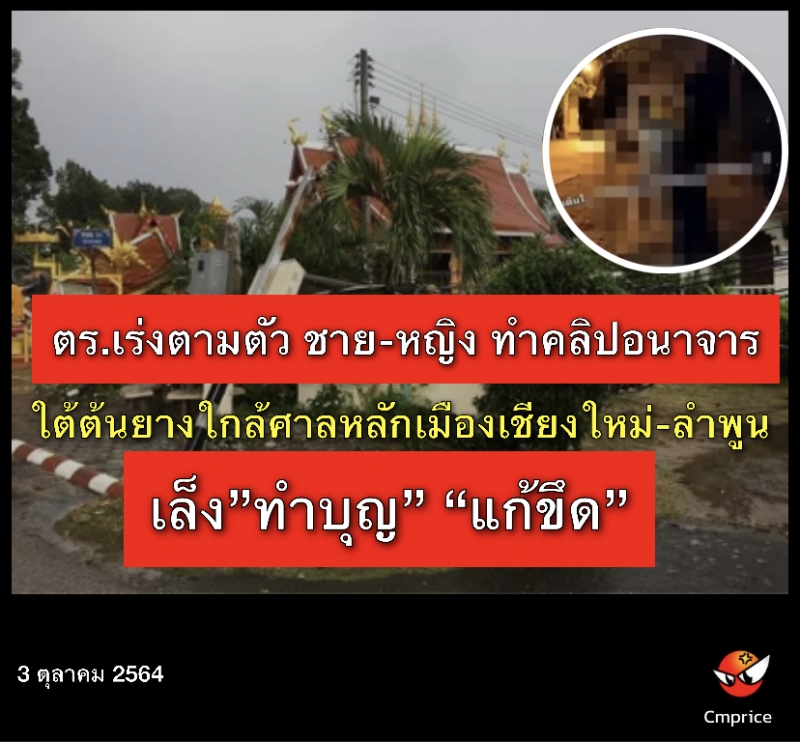 ตร.เร่งตามตัว ชาย-หญิง ทำคลิปอนาจารใต้ต้นยางใกล้ศาลหลักเมืองเชียงใหม่-ลำพูน เล็ง”ทำบุญ” “แก้ขึด”