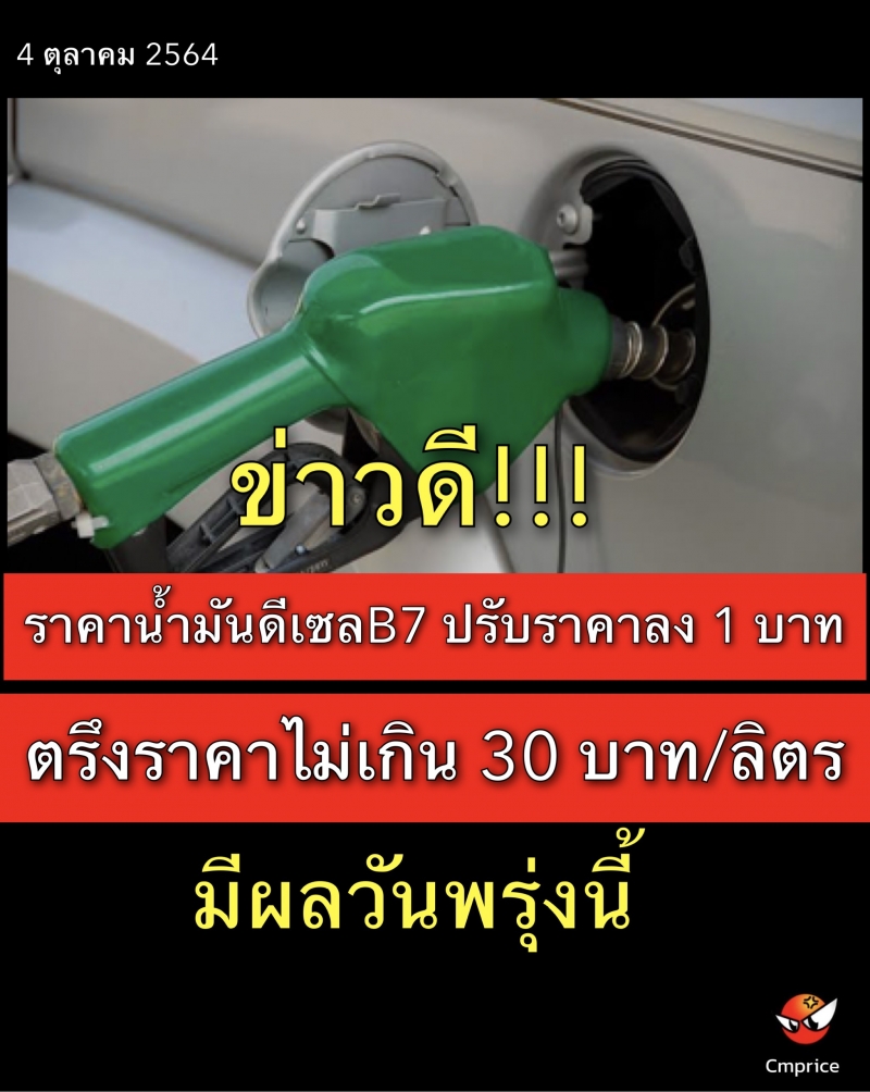 | • ข่าวดี! ราคาน้ำมันดีเซลB7 ปรับราคาลง 1 บาท ตรึงราคาไม่เกิน 30 บาท/ลิตร มีผลวันพรุ่งนี้ |