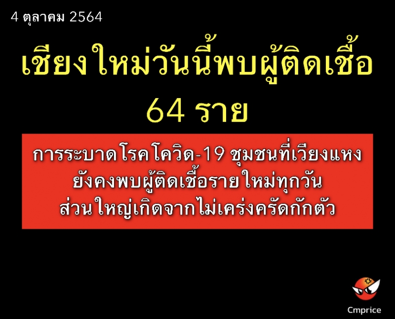 ดร.ทรงยศ คำชัย หัวหน้ากลุ่มงานควบคุมโรคติดต่อ สำนักงานสาธารณสุขจังหวัดเชียงใหม่ เปิดเผยถึงสถานการณ์โรคโควิด-19 ในจังหวัดเชียงใหม่ ว่า วันนี้ (4 ต.ค. 64) จังหวัดเชียงใหม่พบผู้ติดเชื้อรายใหม่ 64 ราย แบ่งเป็นผู้ติดเชื้อที่เดินทางจากต่างจังหวัด 4 ราย ประกอบด้วย กรุงเทพมหานคร 3 ราย และนครราชสีมา 1 ราย