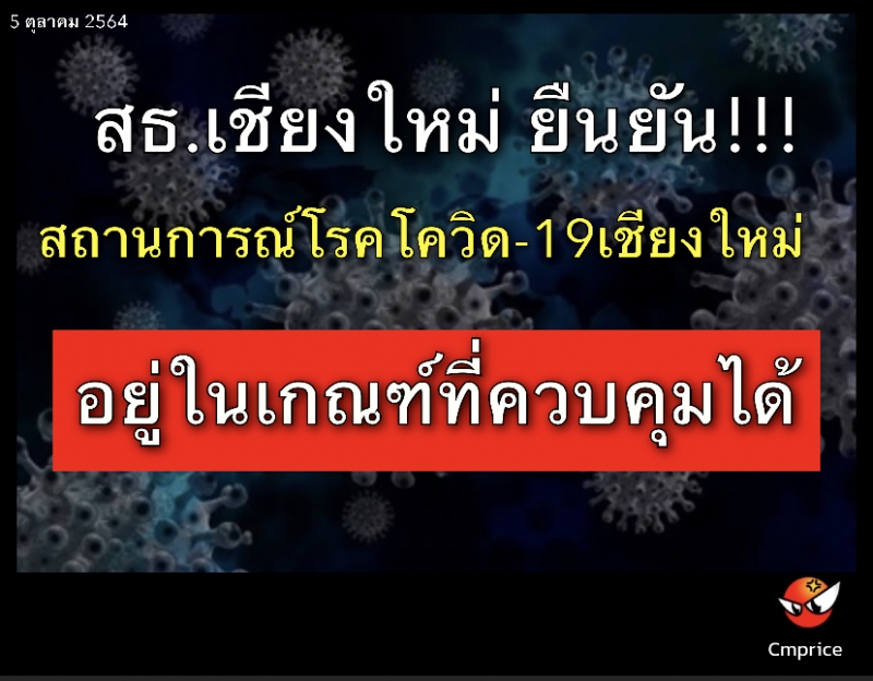 | • สาธารณสุขเชียงใหม่ ยืนยัน สถานการณ์โรคโควิด-19 ของจังหวัดเชียงใหม่ยังอยู่ในเกณฑ์ที่ควบคุมได้ |